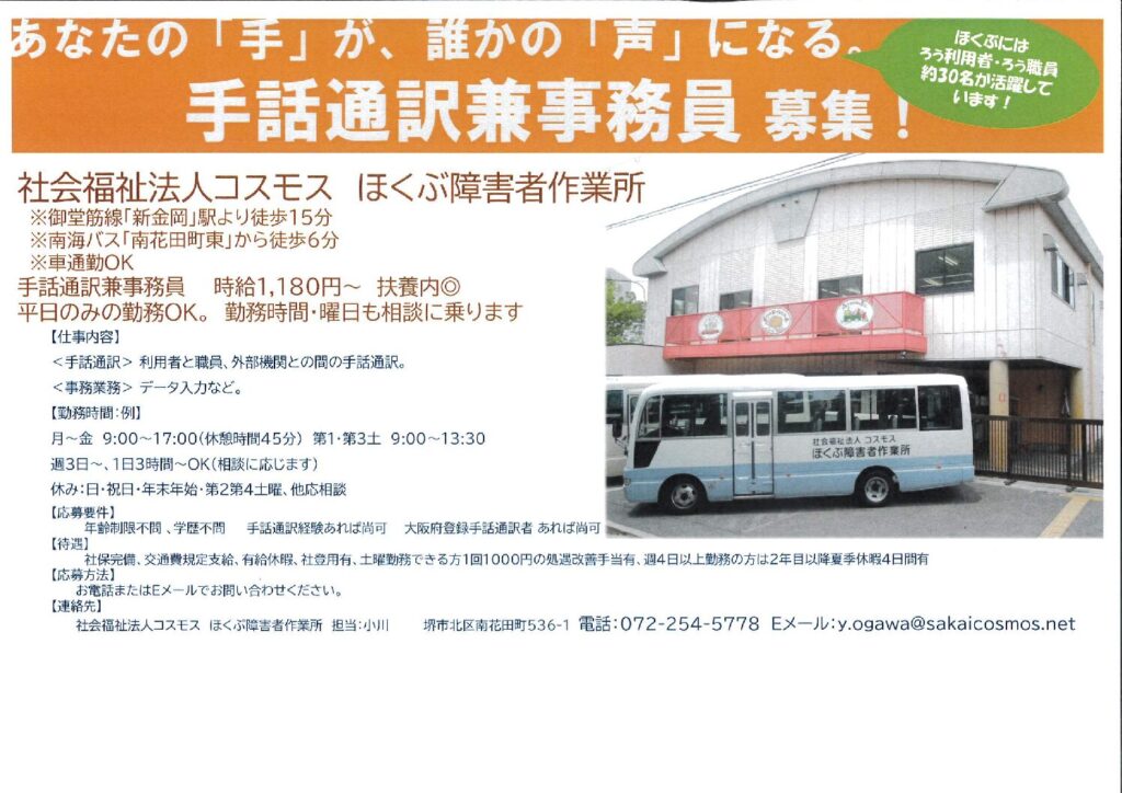 手話通訳兼事務員募集 2025-11-28 最終更新日時 : 2025-11-28 浜本美代子 社会福祉法人 コスモスほくぶ障害者作業所(大阪府堺市北区南花田536-1)では、手話通訳兼事務員を募集しています。ろう利用者、ろう職員約30名が活躍しています。お問い合わせ・ご相談は、別紙、小川さんまで。