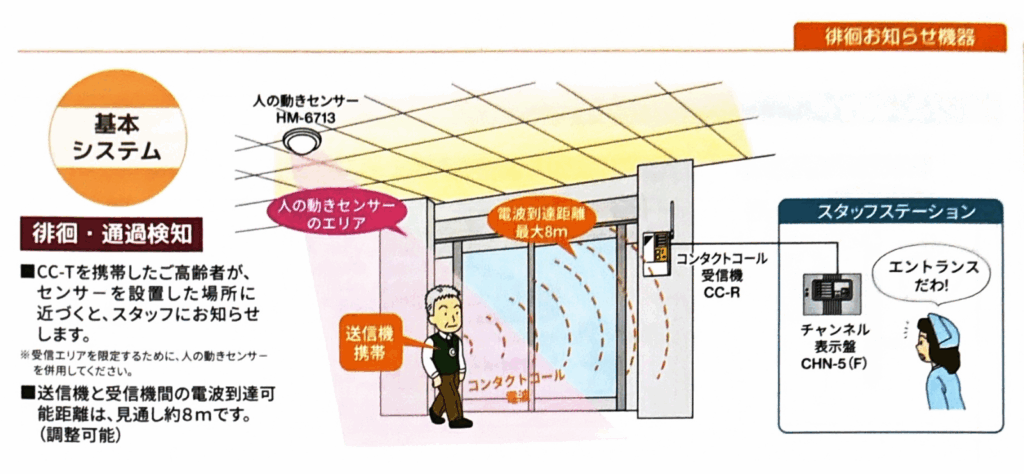 | ⑵徘徊お知らせ機器 | 高齢者の徘徊を検知して通知する機能です。出入口に設置されたセンサーが、利用者が無断で外に出ようとしたことを検知し、音や無線で介護者やスタッフへ知らせます。これにより、早期の発見と事故防止に繋がります。 |