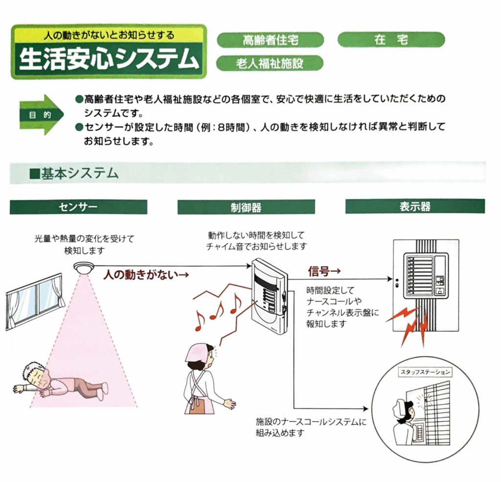| ⑶その他の機能 | 他にも、ベッドからの離床を検知する機能や、トイレの利用時間を把握する機能など、状況に応じた多様なセンサーが用意されています。これらの機器は、ワイヤレスで連携できるため、設置場所を選ばず柔軟なシステム構築が可能です。 |